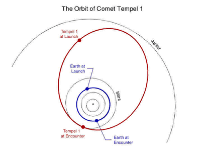 L’orbita di Tempel è situata tra le orbite di Marte e di Giove e nel giorno dell’impatto si presentava secondo questo schema:24 ore prima dell’impatto la sonda ha raccolto una serie di immagini ravvicinate della cometa, per poi rilasciare la capsula, denominata “smart impactor”, sulla superficie del corpo celeste, operando in modo indipendente dalla sonda madre e rimanendo in vita per un solo giorno. Il violento impatto della sonda ha creato un profondo cratere, da cui si è sprigionata una nube di ghiaccio, polvere e detriti e ha prodotto un’esplosione, durante la quale la cometa ha raggiunto un livello di luminosità sei volte superiore a quello ordinario.