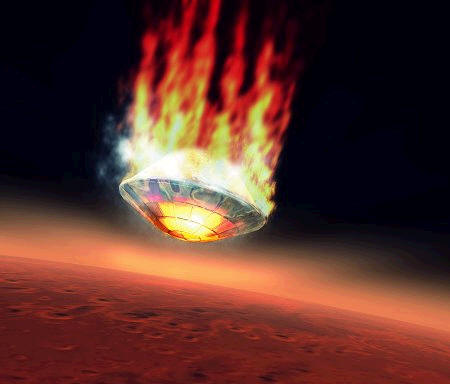 Lo scudo ablativo di Beagle 2 s'infiamma proteggendo il suo prezioso carico durante l’attraversamento degli strati più densi dell’atmosfera marziana. All’altezza prestabilita lo scudo si sgancerà da Beagle, i paracadute si apriranno e gli air-bags si gonfieranno permettendo alla sonda di poggiarsi indenne sulla superficie di Marte.