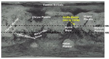 Beagle 2 scenderà su Marte il 26 dicembre del 2003 in una zona situata chiamata “Isidis Planitia” (10.6oN, 270oW), un vasto e pianeggiante bacino sedimentario, che si trova a cavallo fra le relativamente giovani pianure del nord e i più antichi altipiani del sud. Qui, secondo gli esperti, esistono buone probabilità di trovare antiche tracce di vita. L’area si trova ad una quota molto bassa cosa che permetterà ai paracadute di operare al meglio ed a Beagle 2 di sopportare meglio le freddissime notti marziane. Le immagini orbitali mostrano una zona apparentemente poco polverosa e relativamente libera da rocce di grosse dimensioni, capaci di danneggiare gli air-bags con conseguenze disastrose per la missione. Il nome di Isidis Planitia si riferisce ad una zona larga e relativamente piatta addossata ad un terreno di formazione molto antica, situato all’interno di un grande bacino formatosi quattro miliardi di anni fa dall’impatto di una meteora o di una cometa. Osservato da vicino il terreno mostra catene di fitti sedimenti, crateri da impatto e piccole dune di sabbia. Una zona ideale per cercare eventuali tracce di vita.