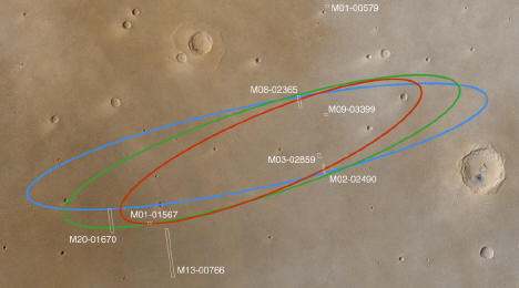 Mappa di Marte con indicata la zona prescelta per l'atterraggio di Beagle 2 Immagine ad alta risoluzione della zona dove scenderà Beagle 2 Immagini della zona d'atterraggio ripresa dal Mars Global Surveyor , le ellissi rappresentano le diversetraiettorie d'avvicinamento